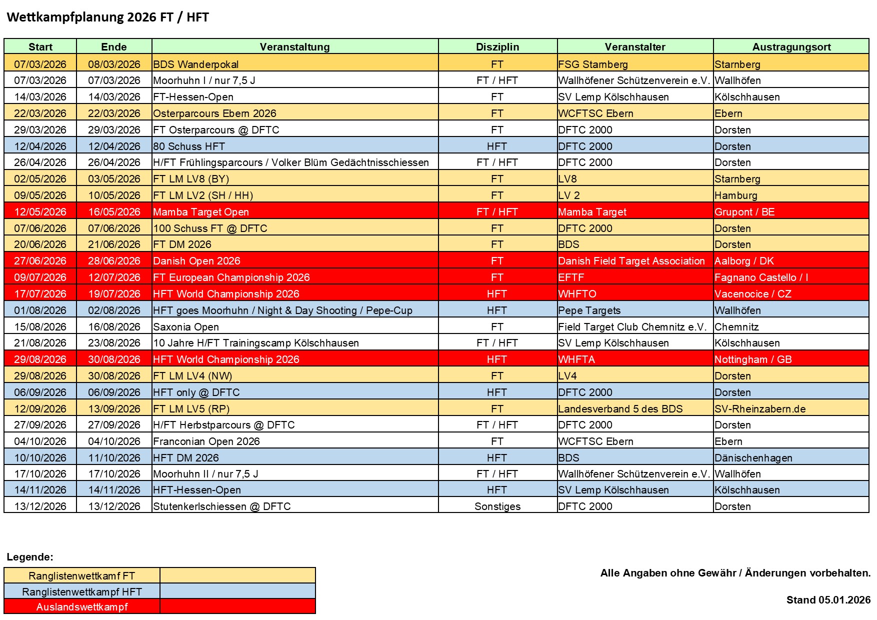 Die Ausschreibungen der einzelnen Wettkämpfe werden von den jeweiligen Veranstaltern zeitnah im Field-Target-Forum unter "Wettkämpfe" veröffentlicht.